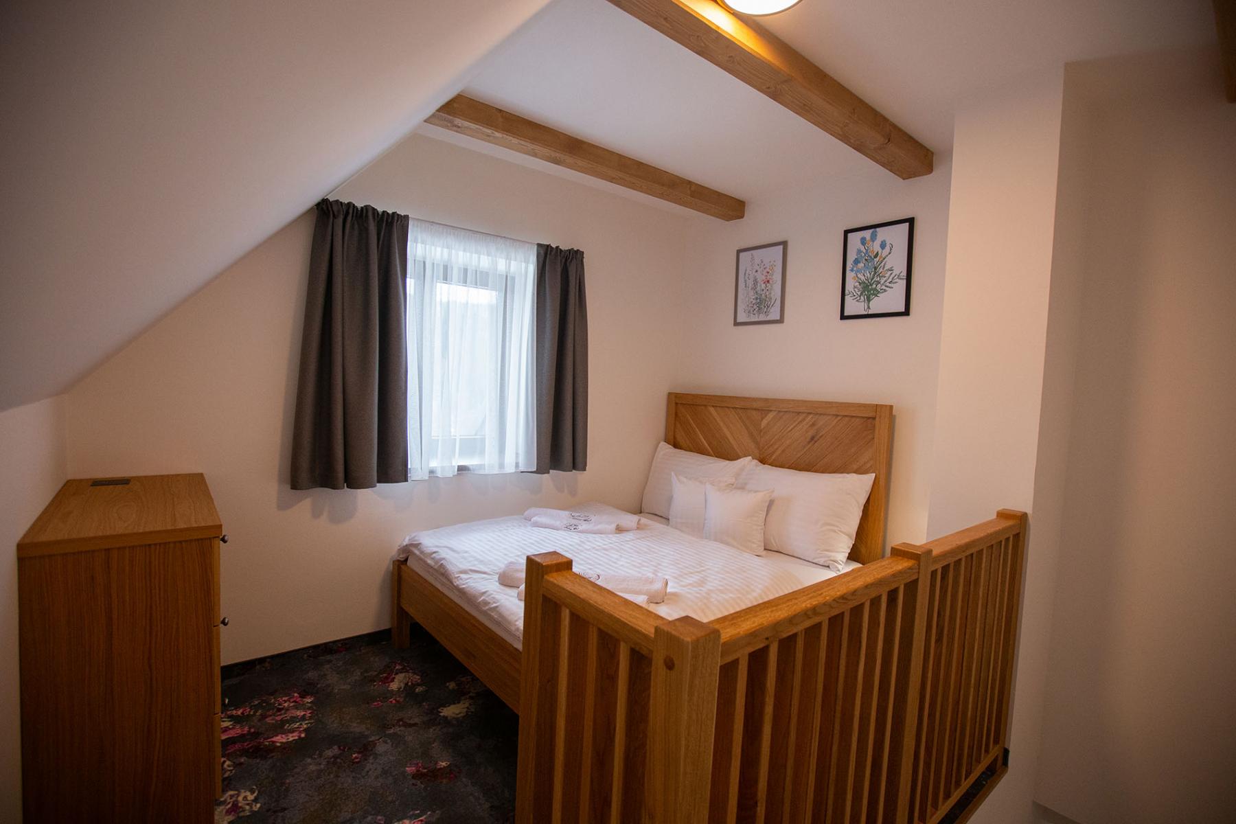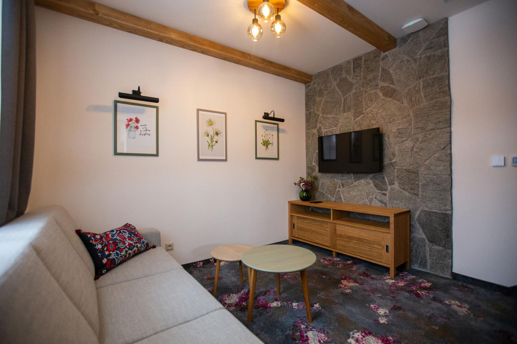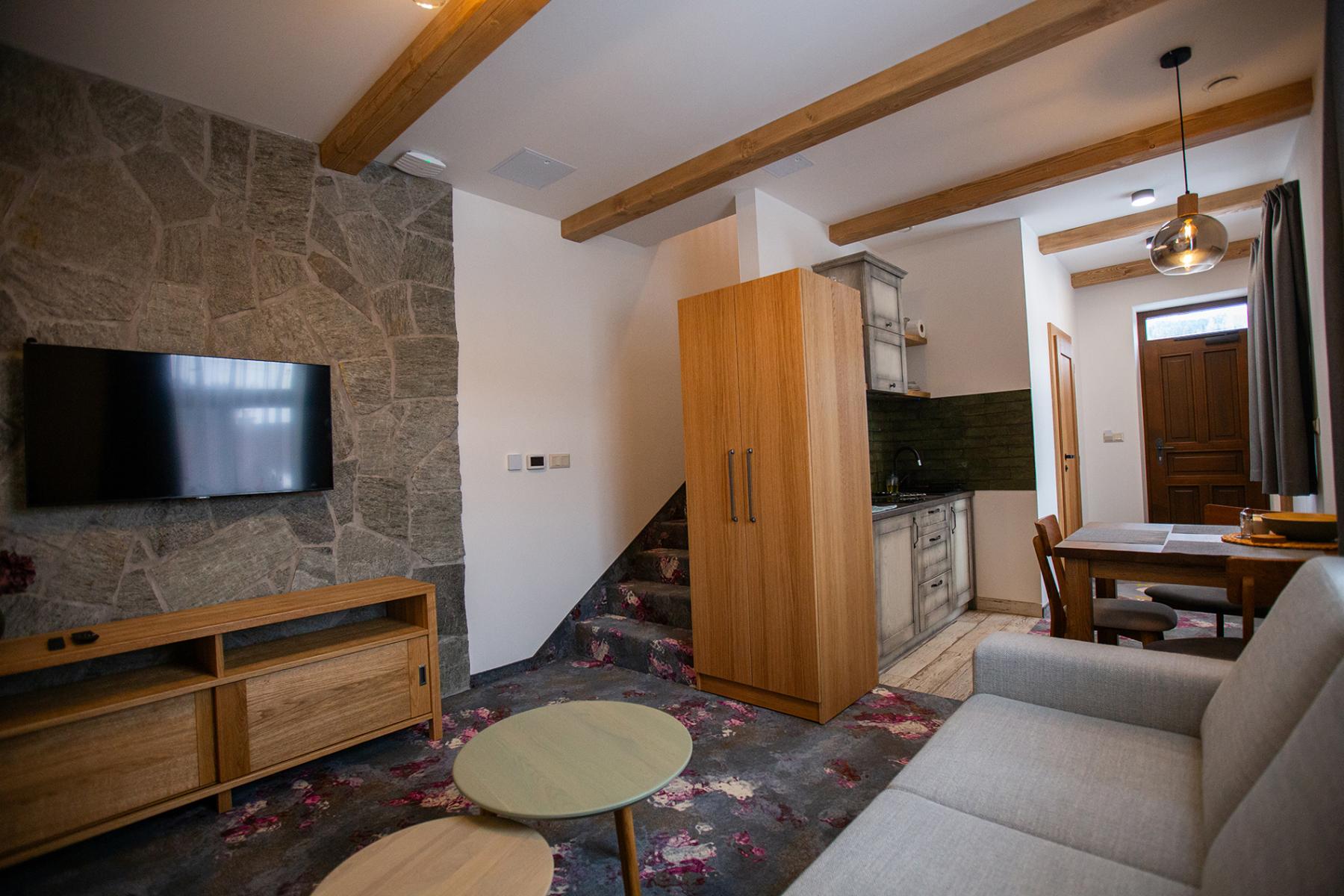 Apartmán sa rozprestiera na dvoch podlažiach. Na prvom poschodí (1NP) sa nachádza útulná obývačka s jedálenským stolom a pohodlnou rozťahovacou sedačkou, kde si môžete oddýchnuť po celodenných výletoch a aktivitách. Na druhom poschodí (2NP) je priestorová spálňa s pohodlnou manželskou posteľou, kde si môžete dopriať zaslúžený nočný odpočinok.