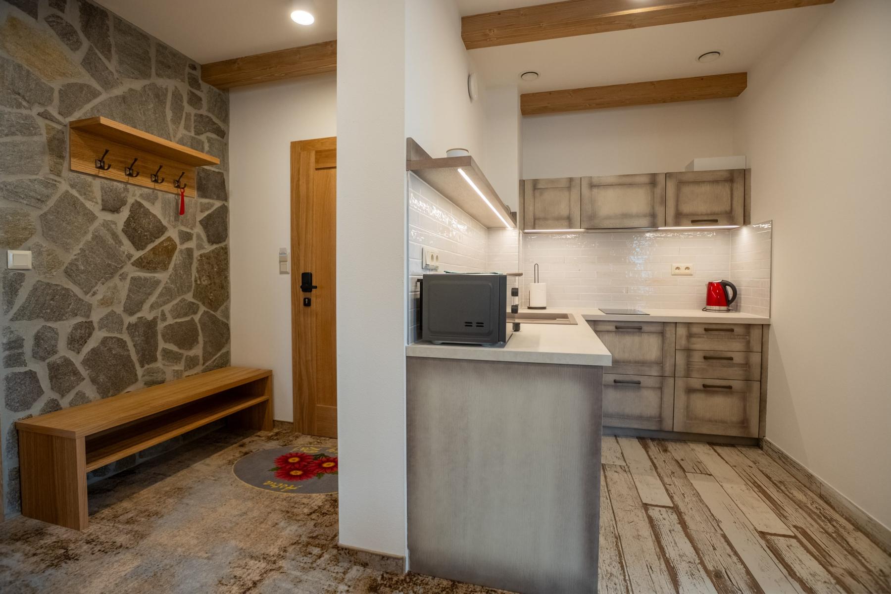 V plne vybavenej kuchyni máte dispozícii elektrickú varnú platňa, mikrovlnnú rúru a rýchlovarnú kanvicu, čo vám umožní bez problémov si pripraviť vaše obľúbené pokrmy.