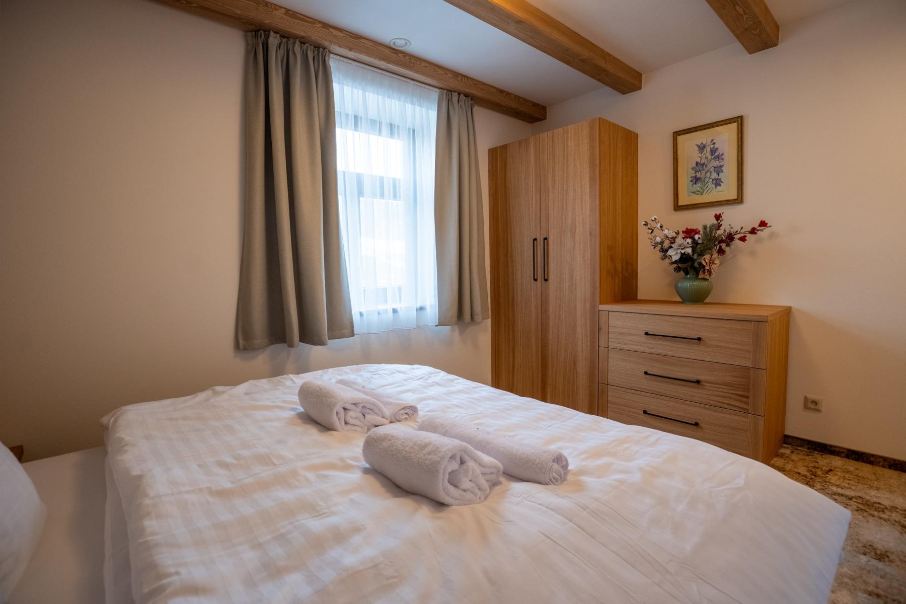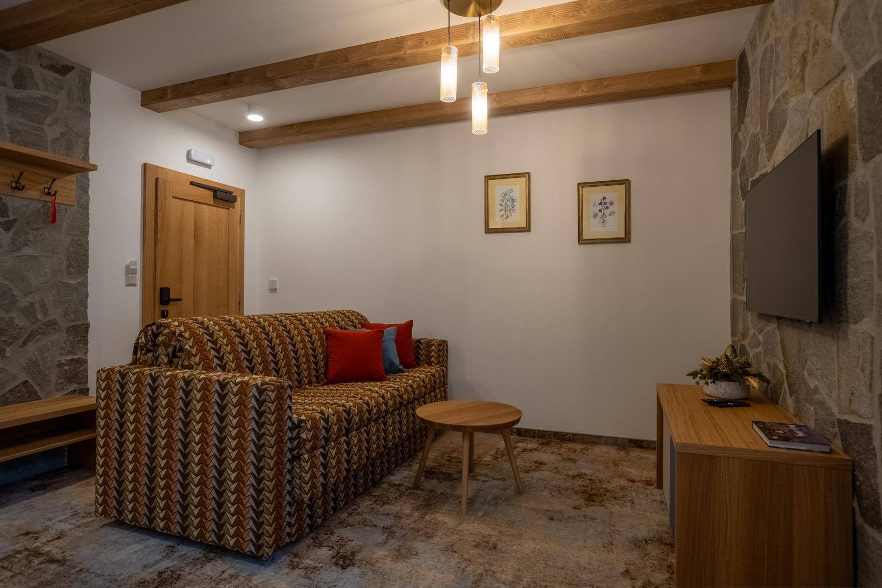 V obývacej izbe nájdete jedálenský stôl, kde si môžete vychutnať spoločné chvíle pri jedle, pohodlnú rozkladaciu sedačku pre 2 osoby a priestor na relax počas vášho pobybu. V spálni vás čaká pohodlná manželská posteľ, kde si môžete oddýchnuť po dni plnom dobrodružstiev.