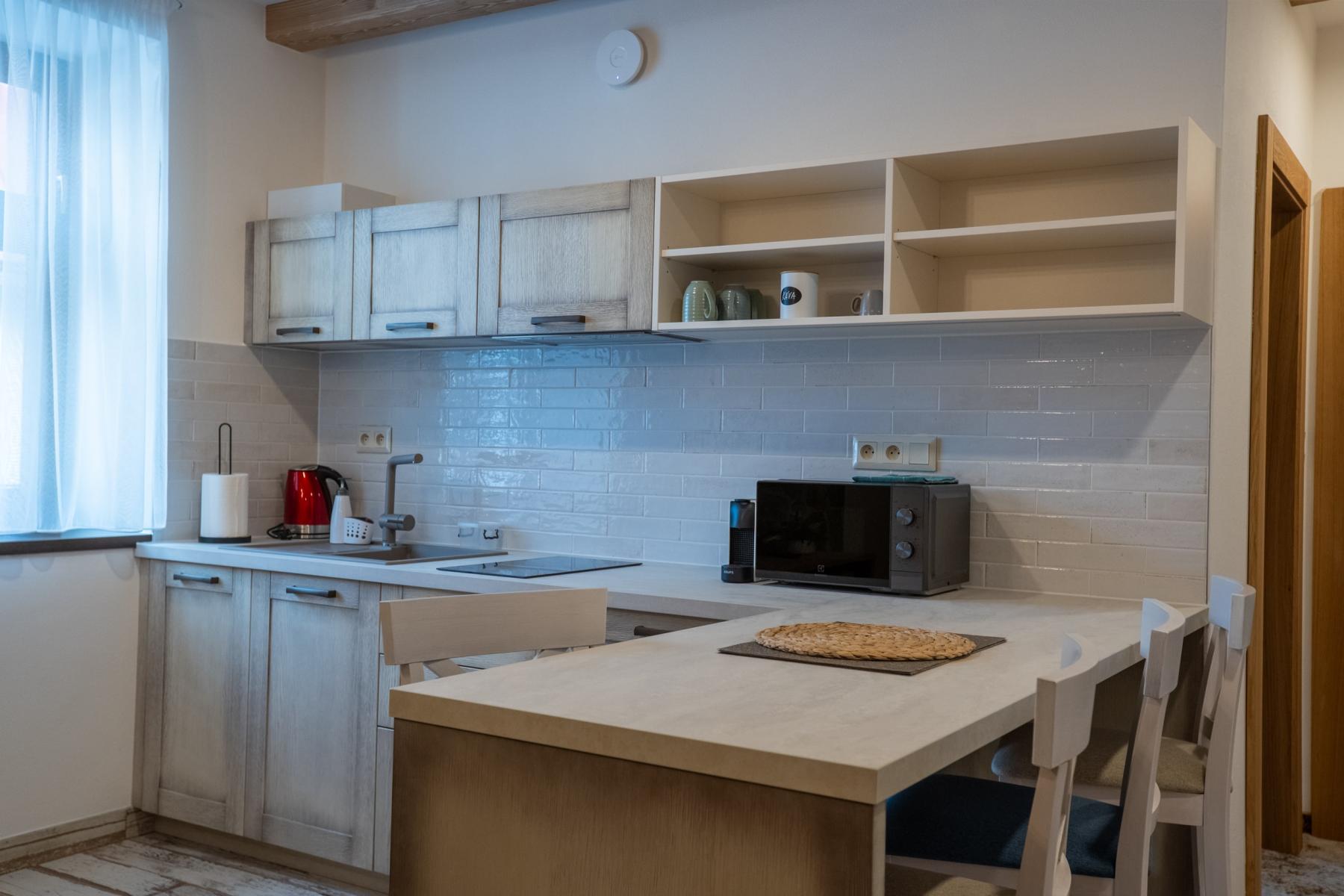 V plne vybavenej kuchyni máte k dispozícii všetko, čo potrebujete na prípravu chutných pokrmov pre seba a svojich blízkych. Kuchyňa je vybavená elektrickou varnou platňou, chladničkou, umývačkou riadu, kávovarom, mikrovlnnou rúrou a rýchlovarnou kanvicou, čo vám umožní pripraviť si vaše obľúbené jedlá bez problémov.