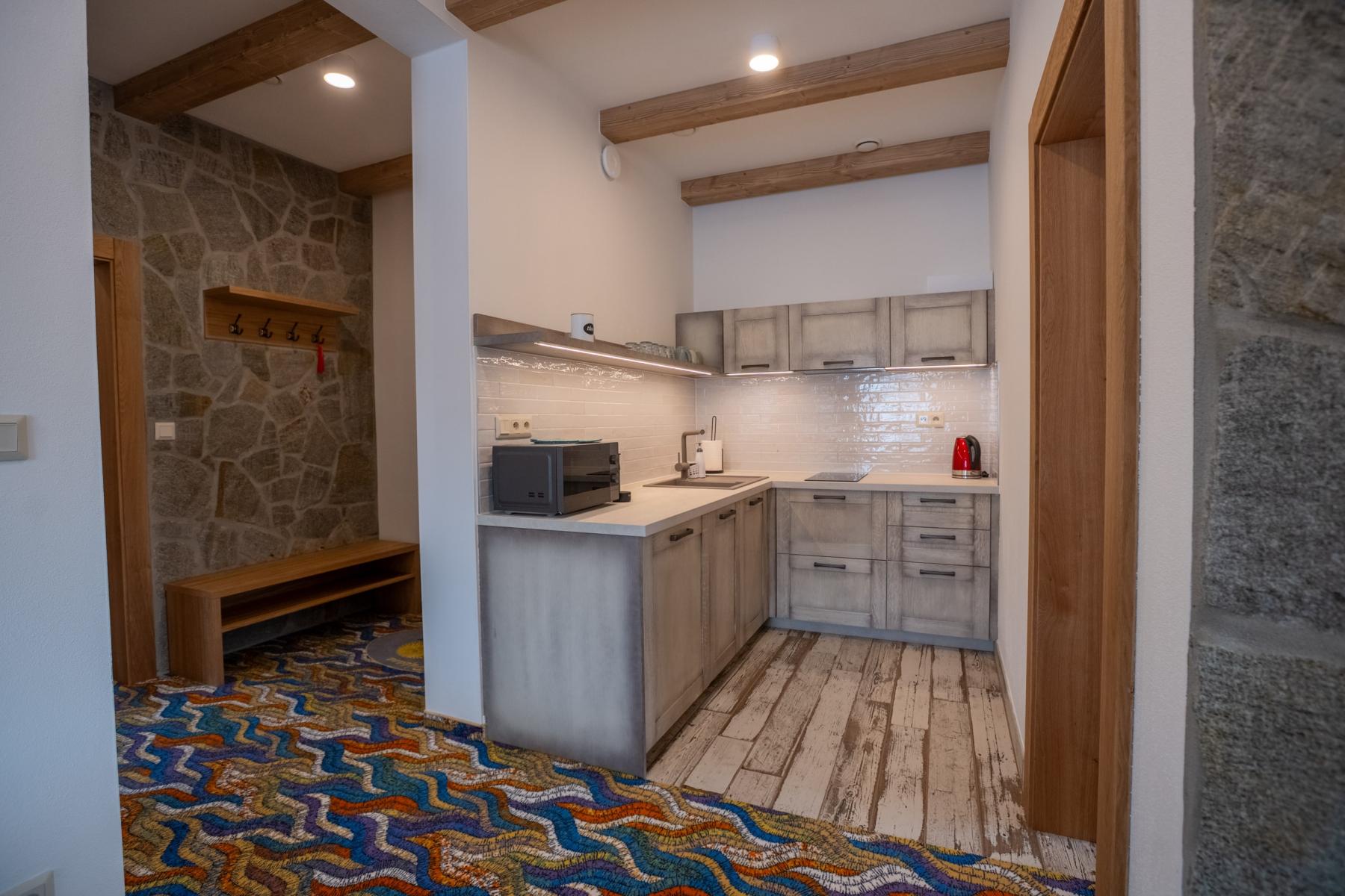 V plne vybavenej kuchyni budete mať k dispozícii všetko, čo potrebujete na prípravu chutných jedál pre seba a svojich blízkych. Súčasťou kuchyne sú elektrická varná platňa, chladnička, umývačka riadu, kávovar, mikrovlnná rúra a rýchlovarná kanvica, čo vám umožní rýchlo si pripraviť vaše obľúbené pokrmy.